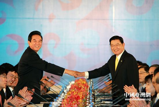 Chairman of the mailand's Association for Relations Across the Taiwan Straits (ARATS) Chen Yunlin (L) shakes hands with Taiwan's Straits Exchange Foundation (SEF) Chairman P.K. Chiang during a cross-Straits meeting in Taipei December 21, 2010. Taiwan and the mainland are planning to sign a medical agreement to share information on epidemics and cooperate in developing new drugs.  (Photo: ChinaTaiwan)