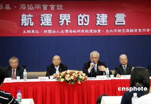 10月30日下午,臺灣海空航運業界代表由臺灣海峽兩岸航運協會常務顧問、長榮集團首席副總裁林省三牽頭,與臺灣領導人馬英九見面并遞交陳情書,希望即將在臺北登場的陳云林與海基會董事長江丙坤會談能排除萬難,實現海空直航,促進兩岸經貿發展,造福于民。隨后,他們在臺北舉行記者會,表示非常歡迎海協會會長陳云林訪臺,并期盼兩岸直航早日落實。 中新社發 黃少華 攝
