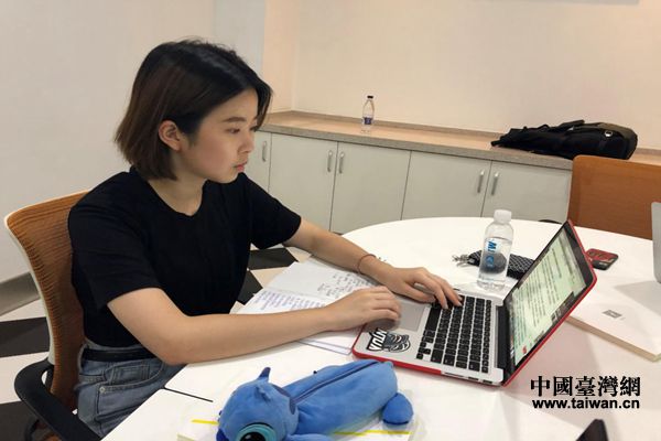 來(lái)自臺(tái)灣藝術(shù)大學(xué)的王心怡在構(gòu)思寫(xiě)稿。(圖片來(lái)源:湖南省臺(tái)辦)