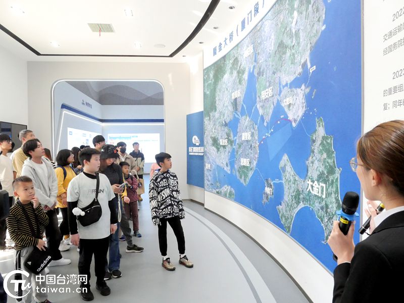 在廈金大橋(廈門段)智慧中心內(nèi),金門青少年們通過數(shù)字影像詳細(xì)了解該項(xiàng)工程的建設(shè)總覽,并從實(shí)物建設(shè)機(jī)械中了解到建設(shè)過程。參觀完展廳后,大家還登上展廳二樓,遠(yuǎn)眺金門和廈金大橋(廈門段)建設(shè)現(xiàn)場(chǎng)。