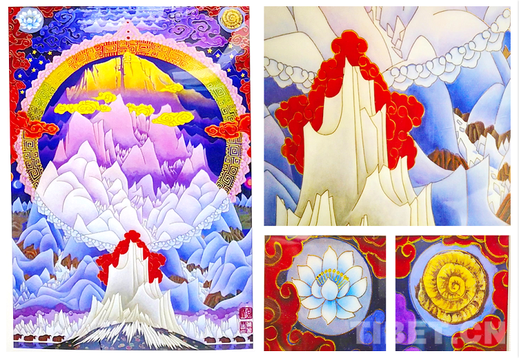 而令葉星生深受觸動的,是十世班禪大師對創作的關心、前衛的創作思路和嚴格的要求!笆腊喽U大師多次提出指導意見,鼓勵我們大膽創新,要融入光影等繪畫新技法及漢族傳統繪畫技法,使珠峰更有立體感,使畫作成為現代藝術技法與藏族傳統繪畫手法相融合的代表,成為民族團結的象征。所以,這幅畫在結構上參考了唐卡,比如彩虹;祥云、太陽、月亮、星斗對稱的方式等來自西藏傳統壁畫藝術;但在光線、明暗對比等方面加入了漢地工筆重彩,甚至西方的藝術手法。在天地之間以更加立體的視角展現出了珠峰壯麗雄偉的全景!