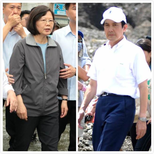 圖為蔡英文(左)日前到嘉義勘災、馬英九(右)2009年視察屏東六龜鄉新開部落災區的開挖情形。(圖片取自臺媒)