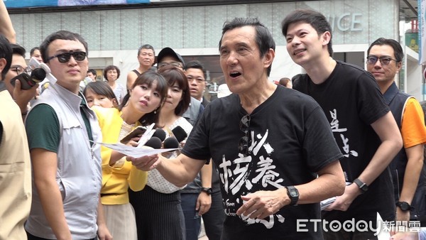 馬英九穿上“我是人,我返核”黑衣上街頭發(fā)聯(lián)署書。(圖片來源:臺灣“東森新聞云”)
