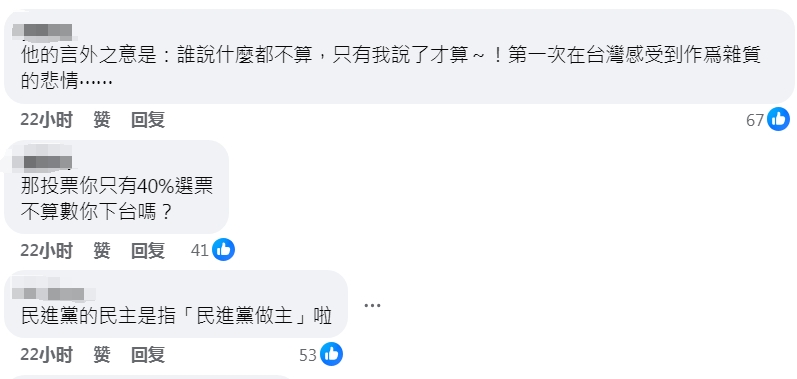 在賴清德還沒(méi)來(lái)得及對(duì)這位綠營(yíng)側(cè)翼的“急呼”作出反應(yīng)之前,不少藍(lán)白支持者搶先留言批評(píng),“不要多管閑事”,“就是想聽一人講十場(chǎng)的笑話”,還有網(wǎng)友嘲諷,賴清德“夢(mèng)幻十講”,一講長(zhǎng)毛象;二講“非我族類都是雜質(zhì)”;三講“民主不是多數(shù)說(shuō)了算”,“才三講就這么精彩絕倫”,“越來(lái)越期待剩下七講了”。