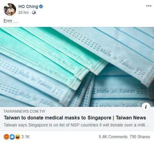 臺灣向新加坡捐贈口罩一事,即是如此。臺灣當局外事主管部門日前宣布將捐贈100多萬片口罩給“新南向國家”,其中包括新加坡。至于新加坡到底能分到幾片,蔡英文至今沒說清楚。消息一出,新加坡總理夫人何晶11日在臉譜網轉貼相關新聞,并寫下“呃……”的評論,結果引起兩派網友論戰。