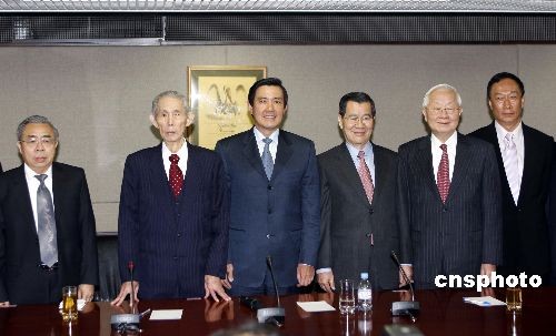 4月7日,馬英九與蕭萬長傍晚拜會臺塑集團創辦人王永慶(左二),就外界矚目聚焦的兩岸三通、大陸投資松綁等議題進行交談。這是馬英九選后“請益之旅”首度公開拜會企業界。 中新社發 杜洋 攝