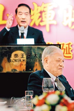 李登輝(前)3日過農歷90歲壽宴,親民黨主席宋楚瑜(后)上臺致詞。圖片來源:臺灣《中國時報》。