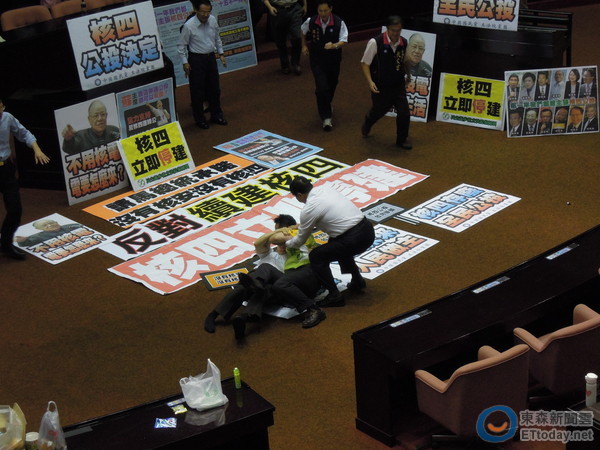 “院會(huì)”排定今天處理核四“公投”案,泛綠陣營昨天傍晚占據(jù)議場(chǎng)主席臺(tái),并鎖上議場(chǎng)后方入口,表達(dá)停建核四決心。