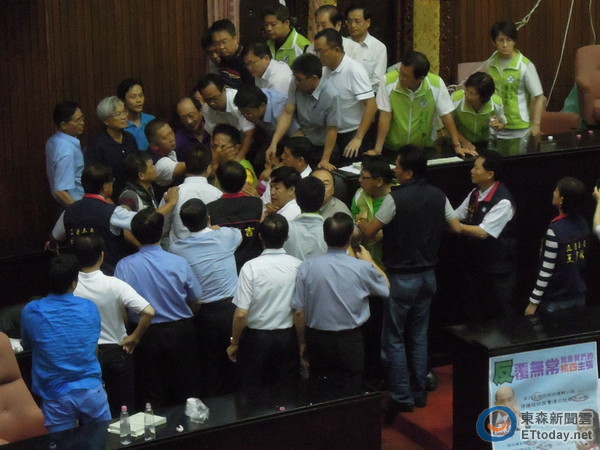 國民黨團(tuán)書記長賴士葆衣服遭扯破,現(xiàn)場(chǎng)許多“立委”潑水,并有推擠場(chǎng)面。