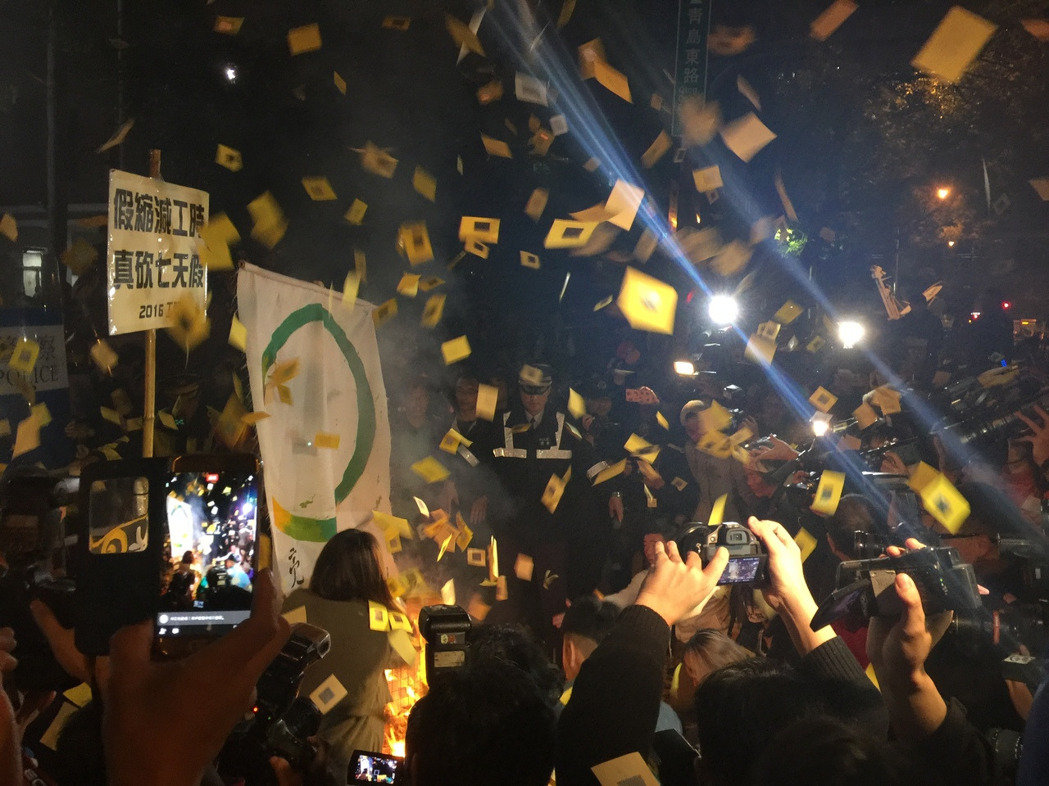 據(jù)報(bào)道,場(chǎng)外抗議的勞工團(tuán)體得知消息后,現(xiàn)場(chǎng)先是彌漫低氣壓,隨即轉(zhuǎn)為憤怒,大喊“民主進(jìn)步,過橋(指奈何橋)。點(diǎn)亮臺(tái)灣,過橋”。抗議群眾氣憤丟執(zhí)煙霧彈,并燃燒蔡英文競(jìng)選時(shí)“點(diǎn)亮臺(tái)灣”的旗幟,更揚(yáng)撒大量冥紙,表示要送民主進(jìn)步“上路”。勞團(tuán)高喊“無恥蔡‘政府’,砍假拼經(jīng)濟(jì)”,嗆聲“如果民進(jìn)黨這么愛錢,我們就燒給他們”,隨即高喊“過橋了”。