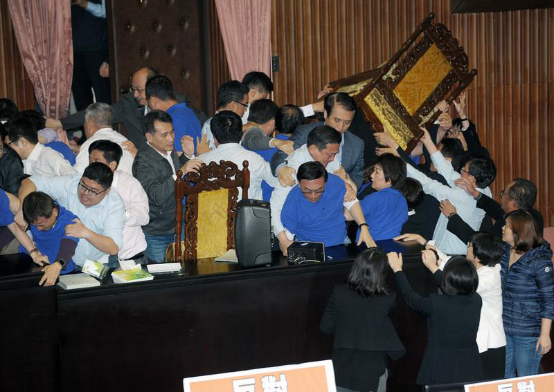 民進黨“立委”沖上主席臺,與國民黨“立委”爆發嚴重肢體沖突。(圖片來源:臺灣“中央社”)