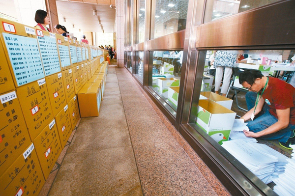 圖為臺(tái)“中選會(huì)”日前處理“公投案”送件。(圖片來(lái)源:臺(tái)灣《聯(lián)合報(bào)》)
