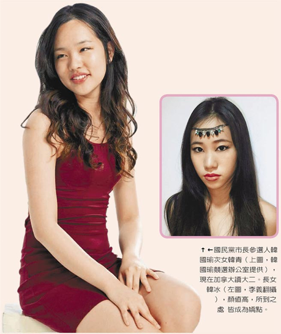 國民黨高雄市長參選人韓國瑜次女韓青(右圖),現(xiàn)在加拿大讀大二。長女韓冰(左圖),顏值高,所到之處皆成焦點(diǎn)。(圖片取自臺媒)