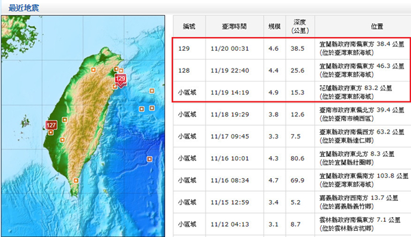 東部海域10小時連3地震,規模分別是4.9級、4.4級、4.6級。(圖片取自臺媒)
