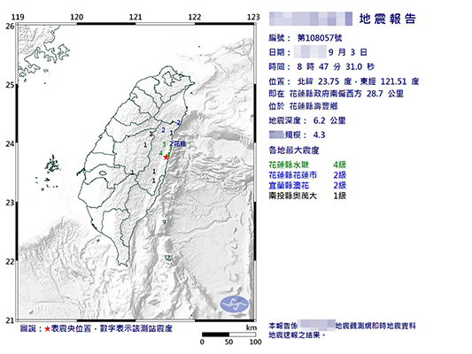 今天上午8時47分在臺灣東部發生里氏規模4.3級的淺層地震。(圖片來源:臺灣“中時電子報”)