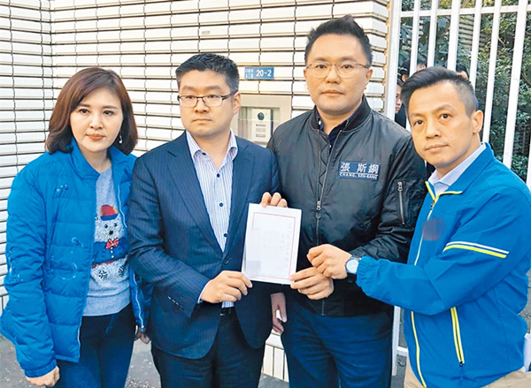 國(guó)民黨臺(tái)北市議員李明賢(右起)、張斯綱、徐弘庭及王欣儀等人,4日來(lái)到臺(tái)當(dāng)局“駐日代表處”遞交陳情書(shū),要求“駐日代表”謝長(zhǎng)廷說(shuō)清楚。(圖片來(lái)源:臺(tái)灣“中時(shí)電子報(bào)”)