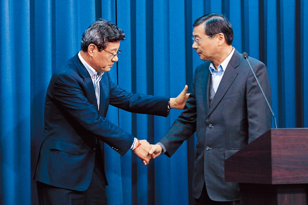 國(guó)民黨15日召開(kāi)選后首次中常會(huì),推舉中常委林榮德(左)代理黨主席,“立院”黨團(tuán)總召曾銘宗(右)暫代秘書長(zhǎng)。(圖片來(lái)源:臺(tái)灣“中時(shí)電子報(bào)”)