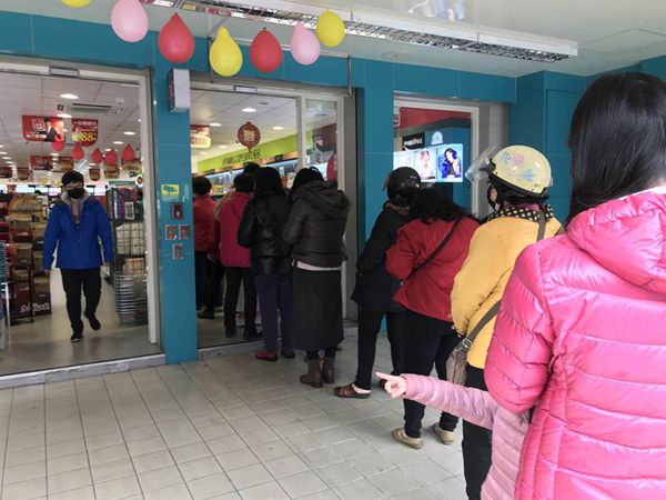 宜蘭市某連鎖藥妝店涌入大量搶購口罩的民眾,排成的隊伍從店內拉到店外的馬路上。(圖片來源:臺灣“中時電子報”)