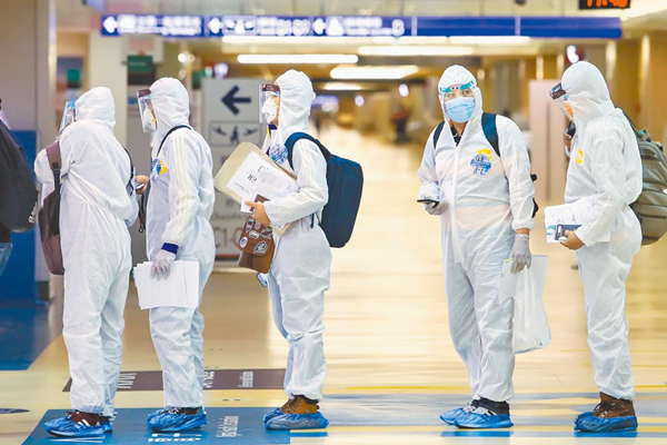 圖為30日旅客全副武裝,做好防護(hù)裝備搭機(jī)返抵桃園機(jī)場(chǎng)。(圖片來(lái)源:臺(tái)灣“中時(shí)新聞網(wǎng)”)