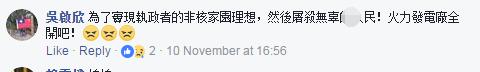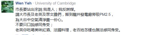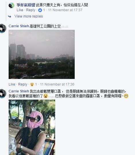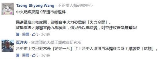 “空氣真的很差,我兒子氣喘都發作了”、“臺中會在第一線用肺幫全臺灣過濾”,深處“霾”伏中的臺中民眾除了憤怒就是無奈,“為了實現執政者的‘非核家園’理想而‘屠殺’無辜民眾”、“臺中火力發電就吸飽飽了,用肺過濾空氣,我們的爛領導人卻還在‘用愛發電’”。