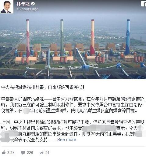 再回頭看看臺中火力發電廠那一根根大煙囪吧,它們被直指是危害中部空氣品質的“殺手”,顏寬恒曾上傳過一張臺中電廠的照片,“嗯??我剛剛到臺中電廠,猛一看發現‘煙囪不見了’”,還調侃說是以為“蔡當局痛定思痛了”。