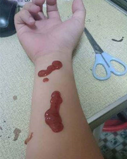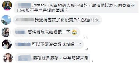 但照片中,明顯可以看出手腕上的并不是鮮血,而是西紅柿醬,讓其他網(wǎng)友看了紛紛笑回,“現(xiàn)在的小孩真的讓人搞不懂,難道他以為我們會(huì)看不出來(lái)那不是血是調(diào)味醬嗎”“薯?xiàng)l雞塊來(lái)給我配一下”“屁孩就是屁孩,拿西紅柿醬來(lái)騙”。