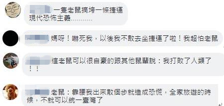 對(duì)此,網(wǎng)友吐槽道: “一只老鼠搞垮一條捷運(yùn)” “嚇?biāo)懒耍院蟛桓胰プ葸\(yùn)啦”;還有網(wǎng)友調(diào)侃道:“這老鼠可以很自豪的跟其他鼠輩說(shuō)我打敗人類了”“老鼠說(shuō)我出來(lái)散個(gè)步就造成恐慌,全家旅游的時(shí)候不就可以統(tǒng)一臺(tái)灣了”。
