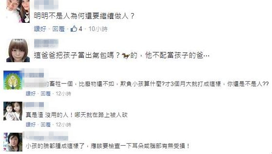 網(wǎng)友說(shuō)道:“小孩才3個(gè)多月大,竟然因?yàn)楹⒆涌摁[而打小孩?如那天被打死了怎么辦?這么小的小孩怎么能受的了28歲大人的力道?”驗(yàn)傷時(shí)醫(yī)院已經(jīng)通報(bào)社會(huì)局報(bào)警處理。
