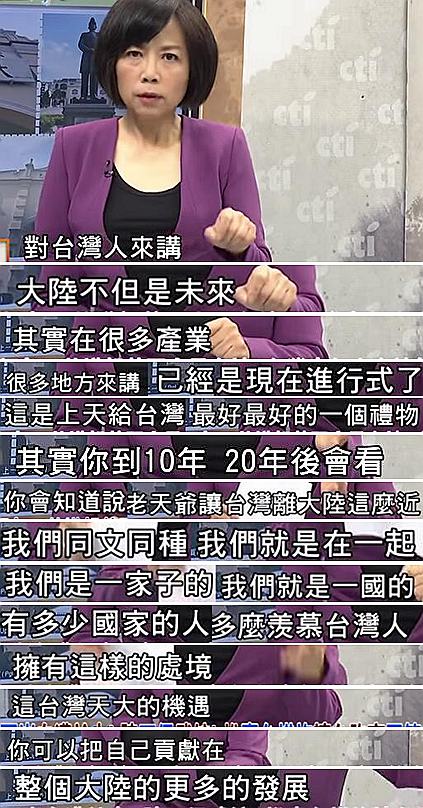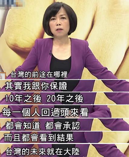 當(dāng)現(xiàn)在越來越多的臺(tái)灣人意識(shí)到他們的未來與出路在大陸時(shí),臺(tái)灣或許還有“救”。黃智賢對(duì)此就很喜聞樂見,她表示也許10年、20年后,臺(tái)灣人回頭看會(huì)發(fā)現(xiàn),能把自己貢獻(xiàn)在整個(gè)大陸的發(fā)展中,是上天給臺(tái)灣最好最好的禮物;黃智賢更強(qiáng)調(diào),兩岸同文同種,“我們就是一國的,多少國家羨慕臺(tái)灣人擁有這樣的機(jī)遇”、“臺(tái)灣的未來一定在大陸”!