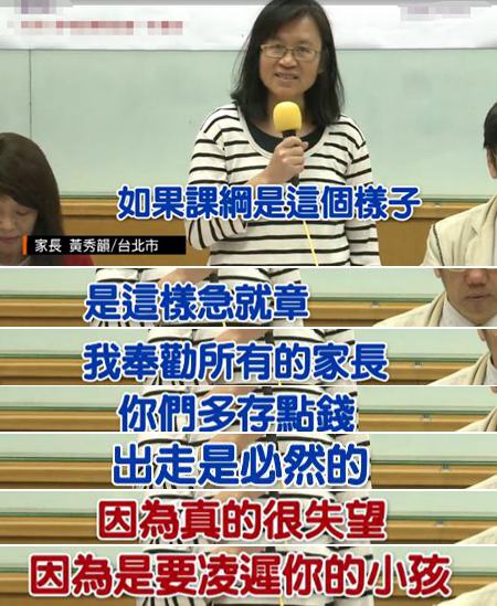 身為高中學生家長的黃秀韻更是氣得痛批,臺當局是意識形態掛帥,稱“教改愈改愈糟,這是凌遲小孩”,還奉勸所有家長“多存點錢”,因為“出走是必然的”。