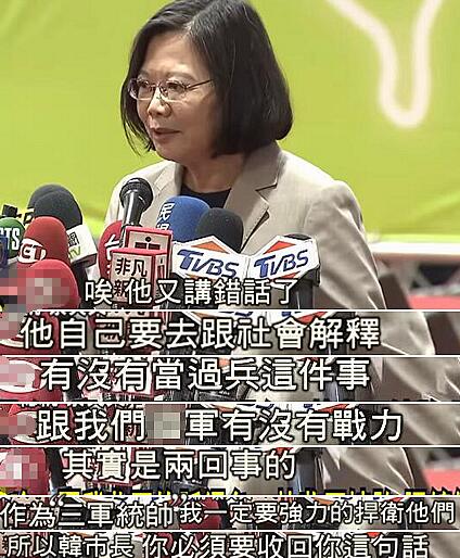 而面對(duì)藍(lán)營(yíng)頭號(hào)戰(zhàn)將韓國(guó)瑜,蔡英文更是長(zhǎng)槍大炮齊上陣,遠(yuǎn)的咱就不說(shuō)了,這兩天她又開(kāi)始揪著韓國(guó)瑜的“太監(jiān)說(shuō)”不放,更仗著自己是“三軍統(tǒng)帥”,兩度嗆韓、要他把話“收回去”。