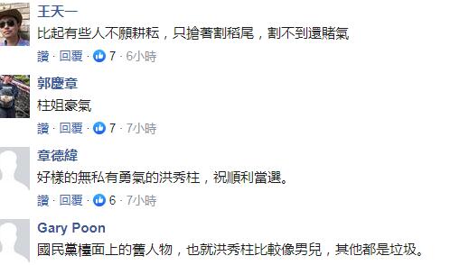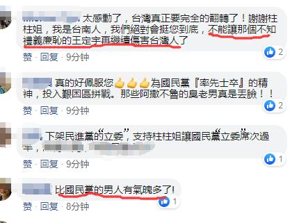 當(dāng)然,對(duì)于國(guó)民黨內(nèi)的“老男人們”,網(wǎng)友的抨擊也是沒有客氣的,“國(guó)民黨這些權(quán)貴真該汗顏,柱柱姐加油”、“比國(guó)民黨的男人有氣魄多了”……