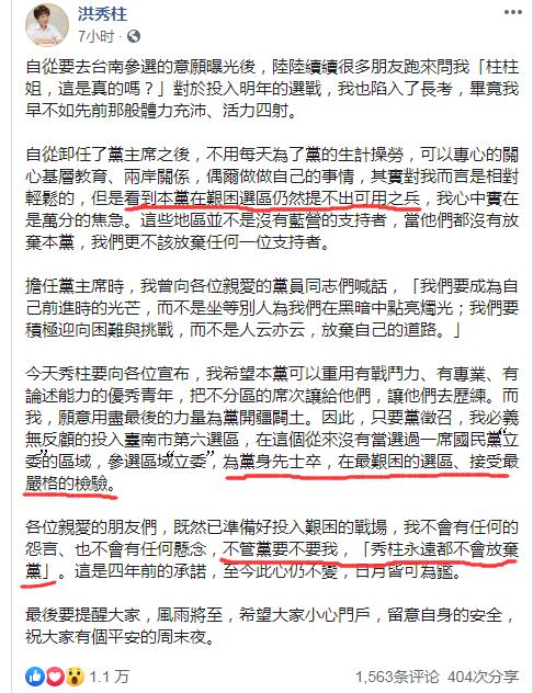 而對(duì)于參戰(zhàn)臺(tái)南的意念,“柱柱姐”先是于9日凌晨,在臉譜網(wǎng)上發(fā)文做了詳盡的解釋,直言艱困選區(qū)并不是沒有藍(lán)營(yíng)支持者,當(dāng)他們沒有放棄本黨時(shí),國(guó)民黨更不該放棄任何一位支持者,并稱自己“愿意用盡最后的力量為黨開疆辟土”、“在最艱困的選區(qū)、接受最嚴(yán)格的檢驗(yàn)”。