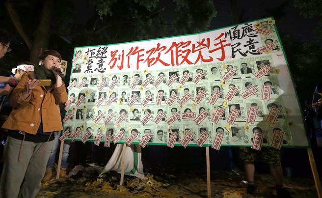 勞工在民進黨“立委”肖像上貼上砍假兇手字條。(圖片來源:臺灣《中時電子報》)