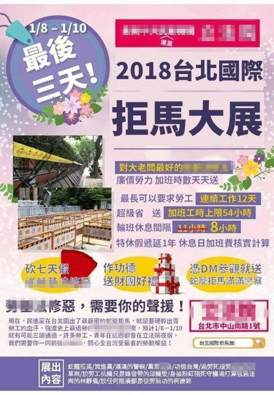 網(wǎng)絡(luò)上流傳的“2018臺北國際拒馬大展”惡搞海報。(圖片來源:臺灣《聯(lián)合報》)