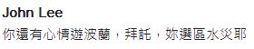 邱議瑩Facebook粉絲頁(yè)也被網(wǎng)友灌爆留言,“可以出來(lái)用罵薛香川的力道來(lái)檢視一下陳建仁嗎?”“怎沒(méi)見(jiàn)你氣到踹門(mén)、砸電視還是快中風(fēng)啊?”“還有心情去金門(mén)旅游,拜托,水災(zāi)欸”“拜托,人家臺(tái)灣價(jià)值欸”“那些災(zāi)民只是錄像帶啦(邱曾指場(chǎng)外勞工抗議是放錄像帶)”,不少網(wǎng)友狂用“拜托水災(zāi)欸”五字洗版。