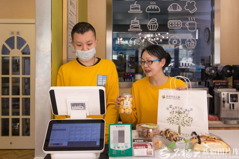 12月17日,烏魯木齊新禾特青烘焙坊,“心青年”(左)與李秀琴協(xié)作收銀。 辛軒 攝