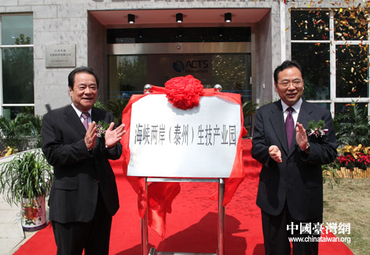 9月19日,“海峽兩岸(泰州)生技產業園”在江蘇省泰州市“中國醫藥城”內揭牌,臺灣工業總會理事長陳武雄(左)出席。(中國臺灣網 鐘寶華 攝)