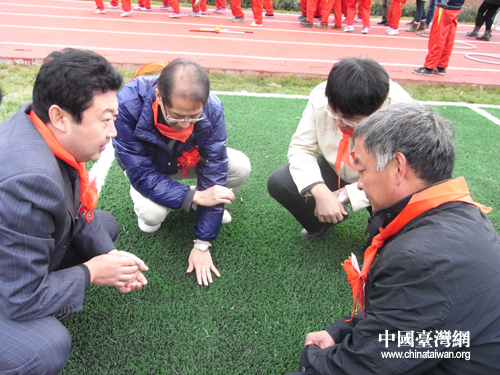 頂新公益基金會理事長騰鴻年與鄉(xiāng)鎮(zhèn)負(fù)責(zé)人及小學(xué)校長一起查看人造草坪足球場質(zhì)量(中國臺灣網(wǎng)記者 蕪?fù)瑪z)