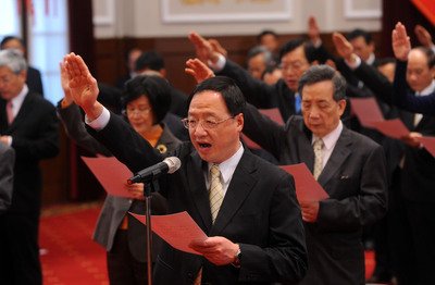 馬英九18日在辦公室主持“行政院”政務(wù)人員宣誓就職典禮,新任“行政院長(zhǎng)”江宜樺率全體眾人完成宣誓儀式。(圖片來(lái)自臺(tái)媒)