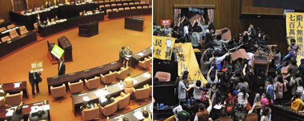 據(jù)報(bào)道,反服貿(mào)人士占據(jù)“立法院”議場(chǎng),議場(chǎng)2樓玻璃窗遭卸除,1樓的地毯沾染煙灰,部分墻壁遭涂污、噴漆,許多專(zhuān)為“立委”特制的扶手滾輪椅也在攻堅(jiān)過(guò)程遭拉扯損毀。