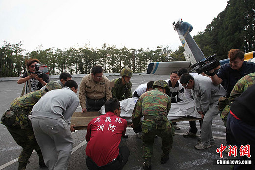 4月27日,臺灣阿里山景區發生小火車翻車事故,現場被當地警方封鎖。下午5點,最后兩個大陸游客遇難者遺體被抬上直升飛機。中新社發 沈存旭 攝