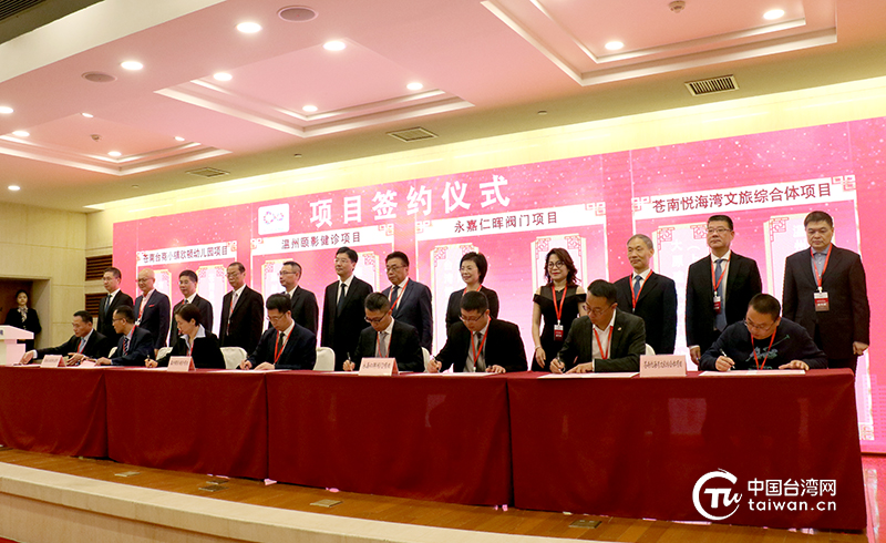 論壇舉行了兩岸投資合作項目簽約儀式。據悉,今年浙江·臺灣合作周期間,達成臺商在溫投資合作項目簽約共5個,涉及健康養老、文化旅游、教育等行業和領域,總投資額達到5.15億美元。(中國臺灣網 普燕 攝)