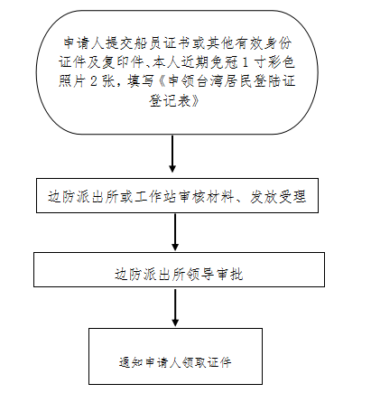 申請人填寫《申領(lǐng)臺灣居民登陸證申請表》,向服務(wù)臺輪停泊點(diǎn)邊防派出所(工作站)提交相關(guān)申請材料。