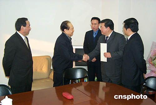 2005年1月31日,海協會長汪道涵(左二)在上海委托其個人代表孫亞夫(右二)和李亞飛(中)赴臺悼念已故的;鶗䲡L辜振甫。