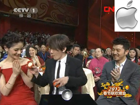 在劉謙開始表演魔術時,他先對身邊的胡可和沙溢夫婦變出了球,再向后一拋變出一個蘋果。他咬了蘋果一口后,將蘋果遞給了身邊的胡可。有網友驚呼:“這不是那個著名的電腦商標嗎?……”